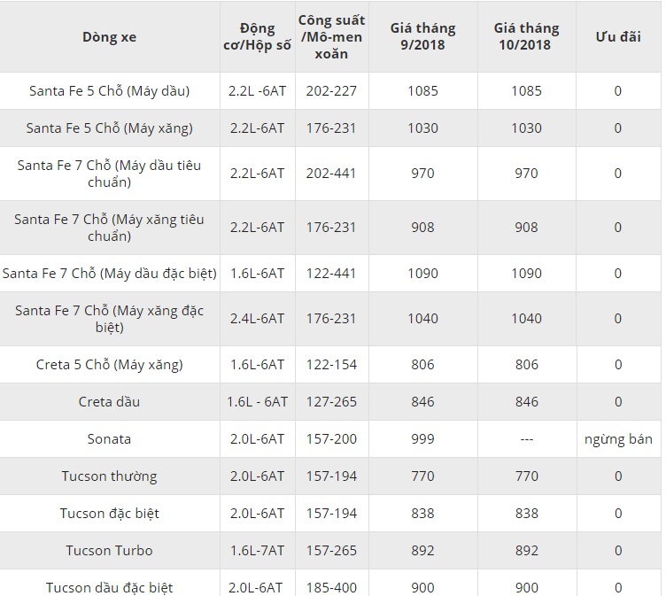 Bảng giá xe Hyundai mới nhất tháng 10/2018. Ảnh: Bán xe hơi |