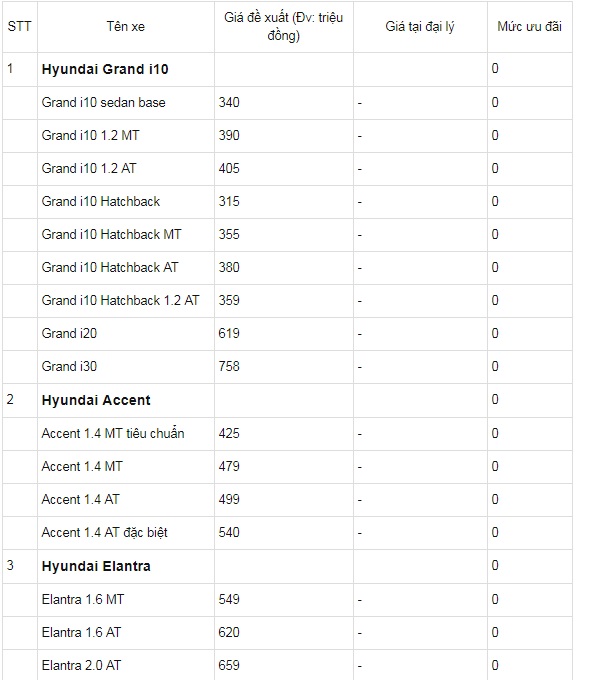 Bước sang tháng 7/2018, giá bán các mẫu xe của Hyundai chưa có sự thay đổi. Các mức ưu đãi vẫn được đai lý duy trì từ 3-15 triệu tùy từng mẫu xe. Hai mẫu xe là Hyundai Grand i10 và Accent đều có giá bán ổn định. Ngoài ra khách hàng còn được tặng phụ kiện trị giá 6 triệu đồng khi mua xe.