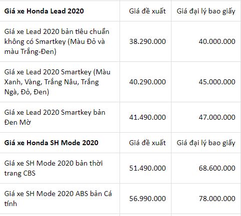 Bảng giá xe máy Honda mới nhất tháng 4/2020. Ảnh: Giá xe |