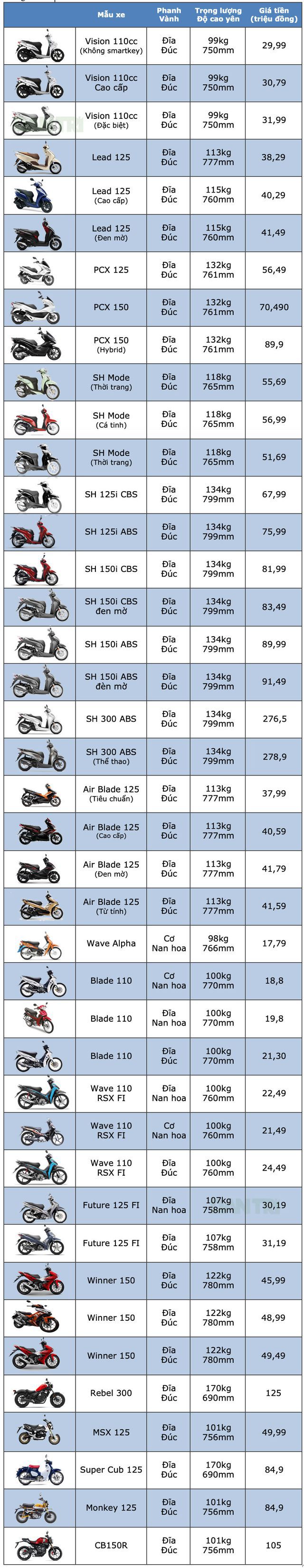 Dưới đây là bảng giá xe máy Honda cập nhật mới nhất: