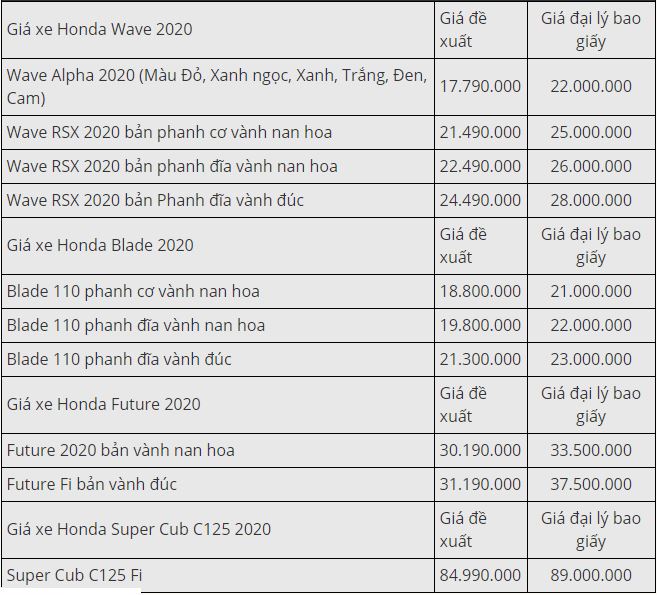 Bảng giá xe máy Honda mới nhất tháng 8/2020 tại thị trường Việt Nam. |