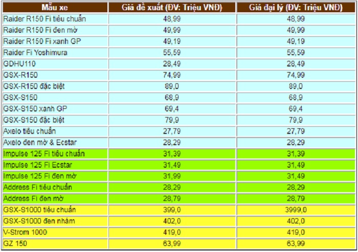 Bảng giá xe máy Suzuki tháng 9/2018 không có sự điều chỉnh nào đối với giá bán của các mẫu xe. Mẫu xe côn tay vốn được người tiêu dùng Việt ưa chuộng như Suzuki Raider vẫn giữ mức giá khoảng từ 49-55 triệu đồng cho các phiên bản. Các mẫu xe khác của Suzuki cũng đều được bán tại đại lý với mức giá không chênh lệch so với giá đề xuất của hãng.