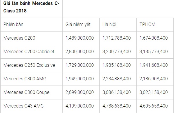 Cụ thể, mẫu xe Mercedes C200 có giá 1,489,000,000 trong khi phiên bản Mercedes C250 Exclusive có giá 1,729,000,000. Mẫu xe Hot nhất hiện nay là Mercedes GLC200 2018 có giá đề xuất 1,684,000,000.