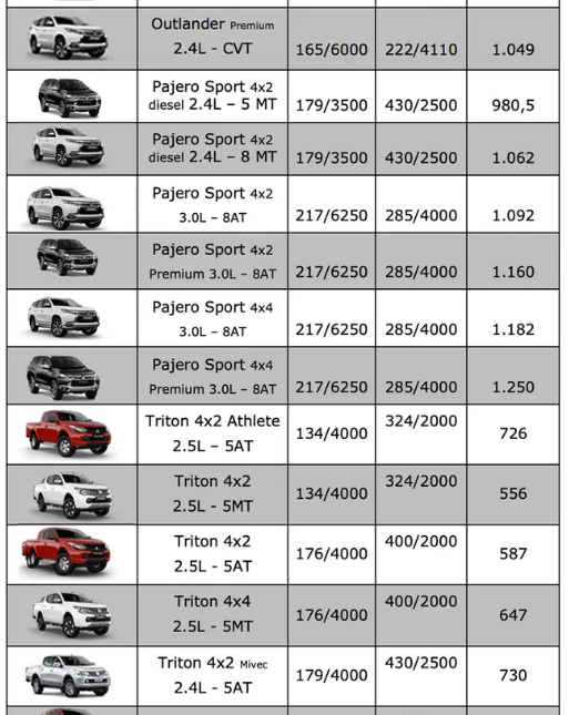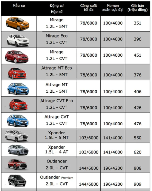 Dưới đây là bảng giá xe Mitsubishi cập nhật mới nhất: