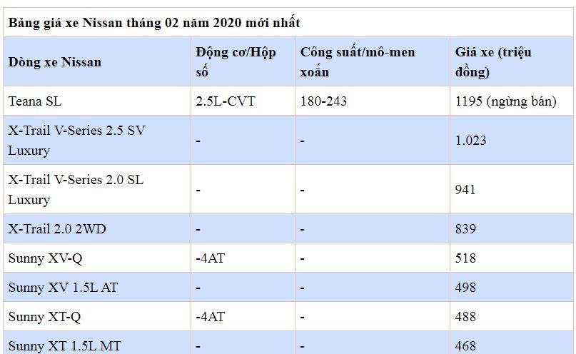 Dưới đây là bảng giá chi tiết xe Nissan tháng 2/2020: