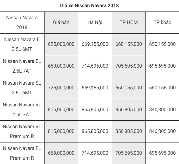 Chiếc bán tải Nissan Navara không có thêm ưu đãi nào mới về giá mà sẽ được hãng tặng thêm các phụ kiện. Nissan Navara hiện đang phân phối tại Việt Nam với các phiên bản: Premium EL giá 669 triệu, Premium VL giá 815 triệu, Navara E giá 625 triệu đồng, Navara EL giá 669 triệu đồng, Navara SL giá 725 triệu đồng, Navara VL giá 815 triệu đồng và Navara NV350 giá 1,095 tỷ đồng.