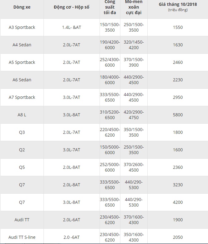 Bảng giá xe Audi mới nhất tháng 10/2018 tại thị trường Việt Nam. Cập nhật thông tin giá các mẫu xe Audi tháng 10/2018 nhanh và chính xác nhất.