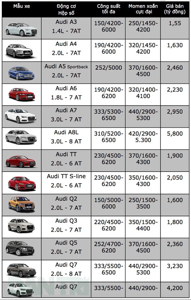 Bảng giá xe Audi tháng 11/2018 hiện không có gì thay đổi so với các tháng trước đó. Danh mục sản phẩm của Audi tại Việt Nam bao gồm sedan A3, A4, A5, A6, A7, A8 và SUV Q2, Q3, A5, A7 cùng xe thể thao TT.