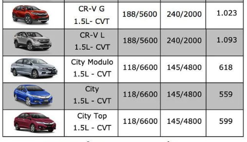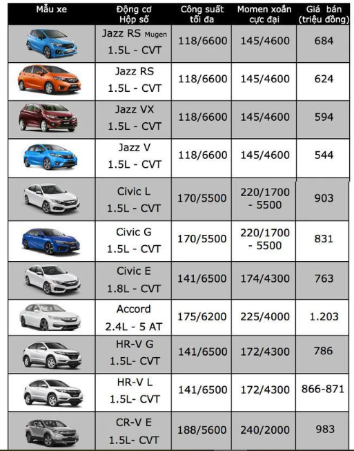 Dưới đây là bảng giá xe ô tô Honda cập nhật mới nhất: