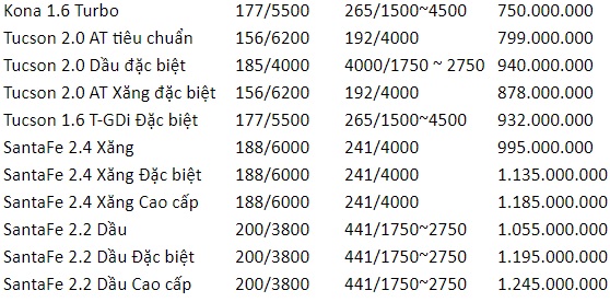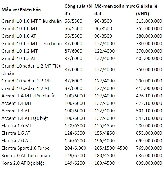 Dưới đây là bảng giá xe ô tô Hyundai cập nhật mới nhất: