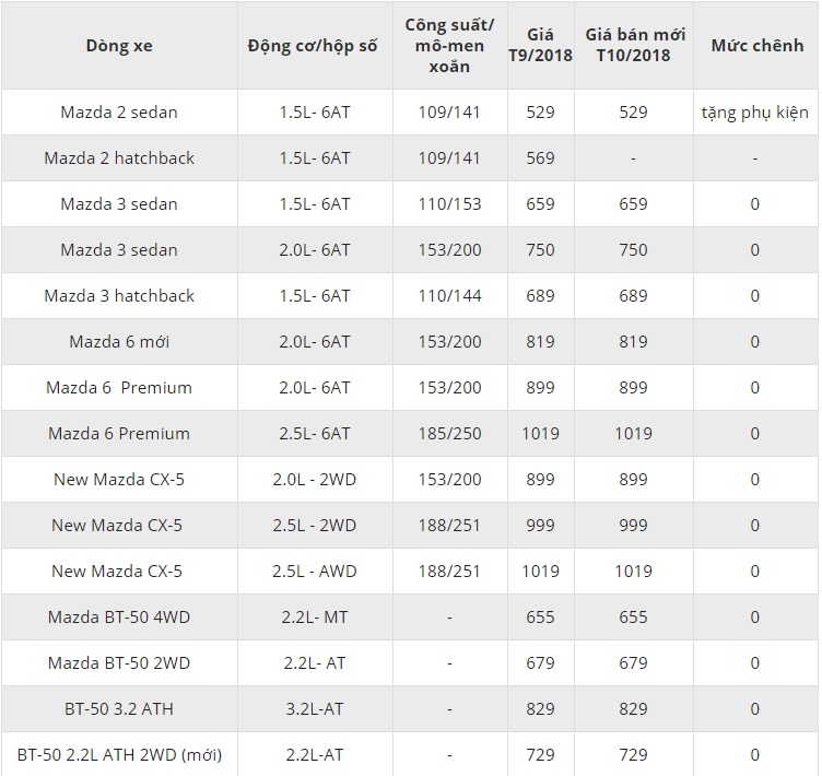 Bảng giá xe Mazda tháng 10/2018 cập nhật mới nhất. Ảnh: Bán xe hơi |