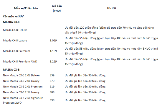 Giá xe ô tô mới nhất của hãng Mazda tháng 4/2021 không có thay đổi nhiều so với các tháng trước đó. Trong tháng này, Mazda Việt Nam tiếp tục duy trì chính sách ưu đãi đến 120 triệu đồng, tùy loại xe. Đơn cử như ưu đãi đến 120 triệu đồng, giảm giá trực tiếp 70 triệu và tặng gói nâng cấp trị giá 50 triệu đồng, áp dụng đối với dòng xe Mazda CX-8 Deluxe.