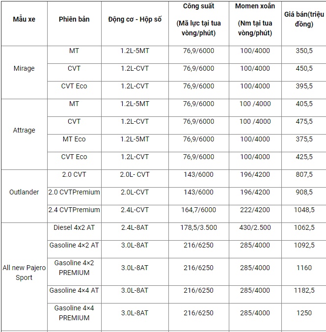 Dưới đây là bảng giá xe ôtô Mitsubishi cập nhật mới nhất: