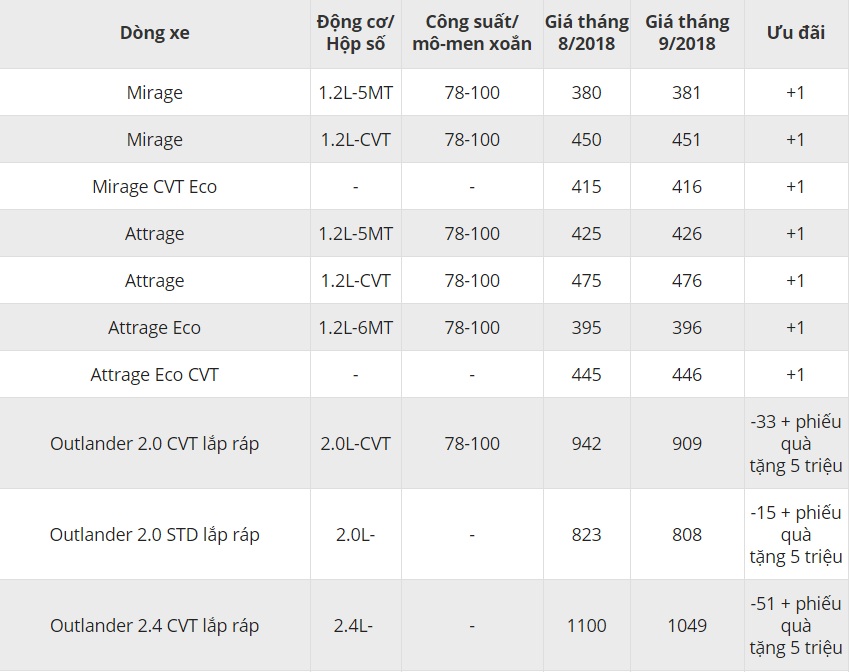 Tạm thời, Mitsubishi Outlander là mẫu xe duy nhất nhận được giảm giá trong tháng 9/2018, trung bình từ 15-51 triệu đồng, kèm 1 phiếu quà tặng 5 triệu và một số phụ kiện. Cụ thể, phiên bản Mitsubishi Outlander 2.0 CVT giá gốc 942 triệu, giảm 33 triệu còn 909 triệu; phiên bản Outlander 2.4 CVT giá gốc 1,1 tỷ giảm 51 triệu, còn 1,049 tỷ đồng; Outlander STD giá gốc 823 triệu, giảm 15 triệu còn 808 triệu đồng.