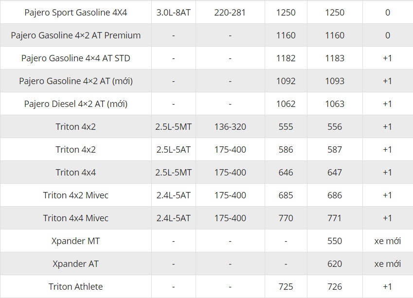 Bảng giá xe Mitsubishi Triton tháng 9 cũng tăng chung 1 triệu đồng. Cụ thể, các phiên bản Mitsubishi Triton 4x2 AT, 4x4 MT, 4x2 Mivec, 4x4 Mivec có giá tương ứng 607 triệu đồng, 647 triệu đồng, 686 triệu và 771 triệu đồng. Còn lại phiên bản Triton 4x2 MT giữ giá thấp nhất, 556 triệu đồng.