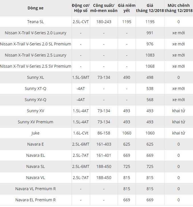 Bảng giá xe ô tô Nissan mới nhất tháng 12/2018 tại thị trường Việt Nam. Cập nhật thông tin giá các mẫu ô tô Nissan tháng 12/2018 nhanh và chính xác nhất.