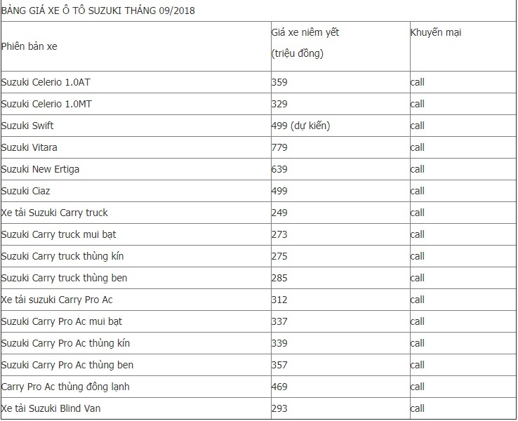 Dưới đây là bảng giá chi tiết các mẫu xe ô tô Suzuki mới nhất tháng 9/2018:
