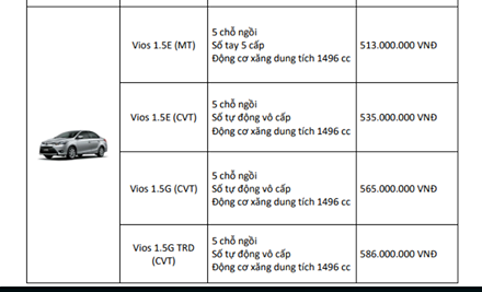 Mức giảm 20 triệu dành cho tất cả các phiên bản. Sau khi khuyến mại, giá xe Vios cụ thể là, bản E MT giá 493 triệu đồng, bản E CVT giá 515 triệu và bản G CVT giá 545 triệu. Trong khi đó, các mẫu xe lắp ráp khác như Corolla Altis và Innova giữ nguyên giá niêm yết.