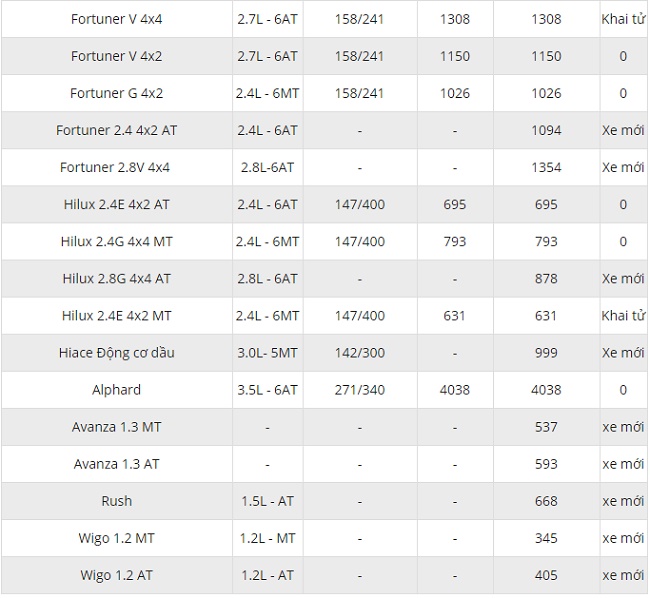 Hiện mẫu xe Toyota có giá bán thấp nhất hiện nay là Wigo, giá từ 345 – 405 triệu đồng và cao nhất là Alphard có giá 4,038 tỷ đồng.