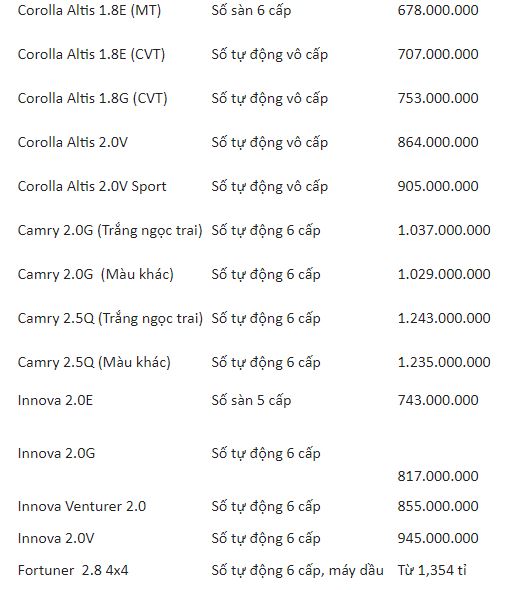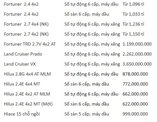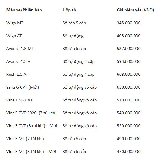 Trong bảng giá Toyota tháng 4/2020, các mẫu Vios, Wigo, Avanza, Rush, Yaris, Altis, Camry, Innova, Fortuner, Land Cruiser Prado, Land Cruiser, Hilux và Hiace có giá từ 345 triệu đến 3,650 tỷ đồng.