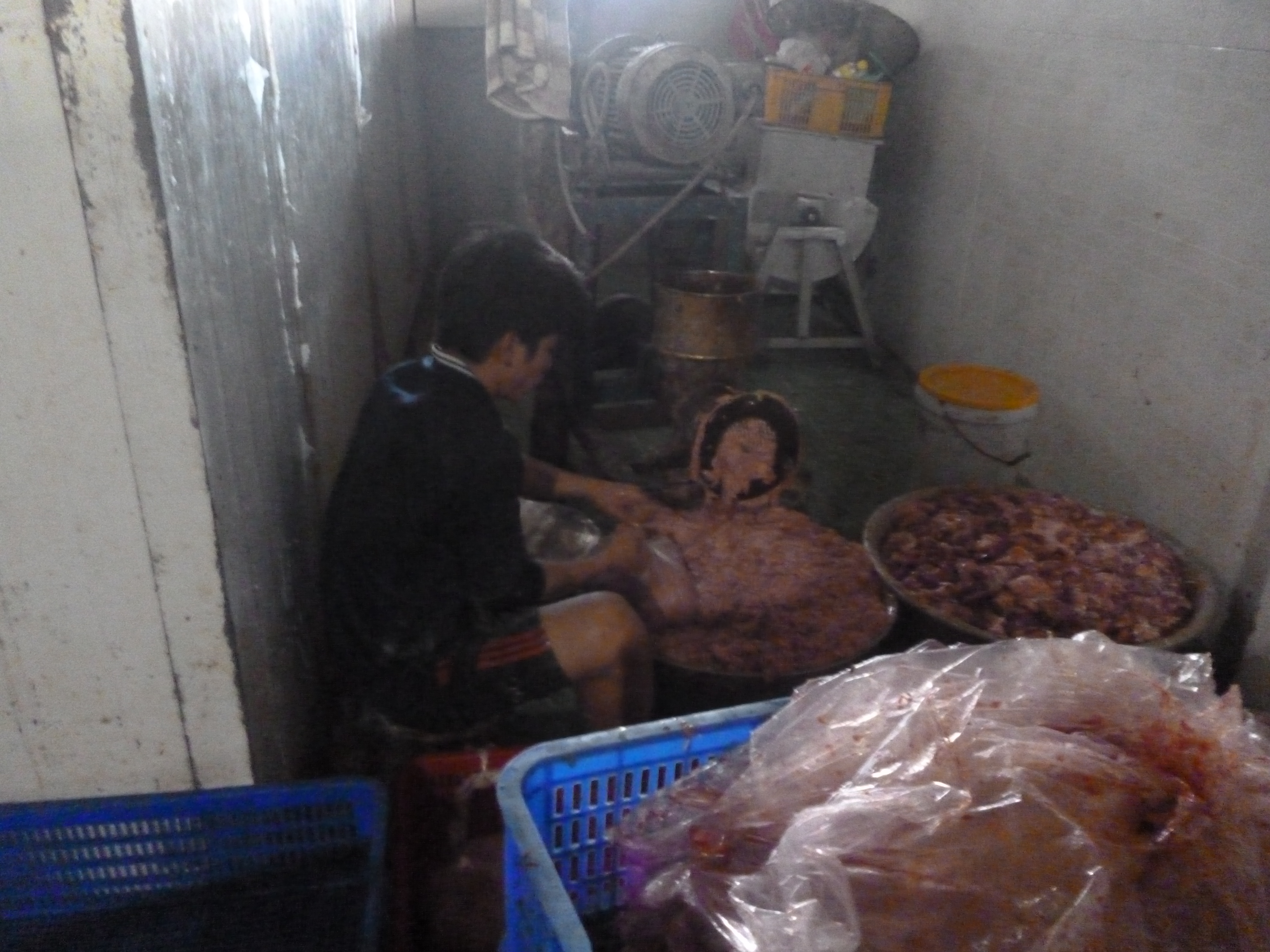 Sự thật khủng khiếp về cơ sở sản xuất này dần được hé mở, khi PV theo chân đoàn liên ngành vào khu vực chứa nguyên liệu. Tại đây, một lượng lớn thịt gà đông lạnh, bò vụn tạp, thịt heo thối, mỡ heo, bột mì... (tất cả đều không rõ nguồn gốc) được xếp chồng chất lên nhau. Lượng thịt tươi, đông lạnh và thịt xay đang chờ đưa vào chế biến lên tới 1,1 tấn. Tất cả đều không có giấy chứng nhận kiểm dịch, không rõ nguồn gốc.