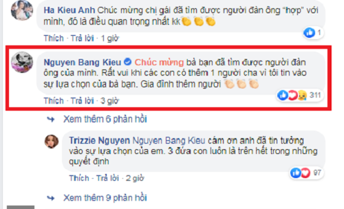 Cũng ngay dưới phần bình luận, ca sĩ Băng Kiều cũng để lại lời nhắn đầy tình cảm gửi vợ cũ: "Chúc mừng bà bạn đã tìm được người đàn ông của mình. Rất vui khi các con có thêm một người cha vì tôi tin vào sự lựa chọn của bà bạn. Gia đình thêm người".