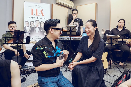 Ca sĩ Bằng Kiều có mặt trong buổi tập nhạc cùng với Quang Hà. |