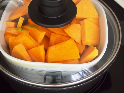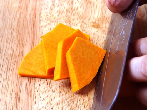 Gọt vỏ bí đỏ và loại bỏ hạt rồi cắt bí thành từng miếng nhỏ.