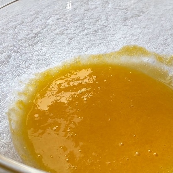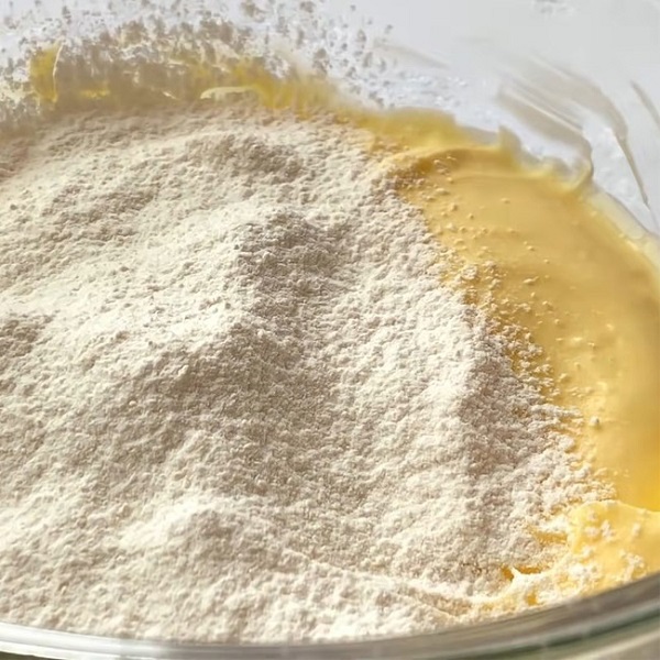 - Đặt 1 chiếc rây lọc lên miệng bát trứng vừa đánh bông, đổ 20gr bột làm bánh qua rây lọc rồi trộn đều các nguyên liệu.