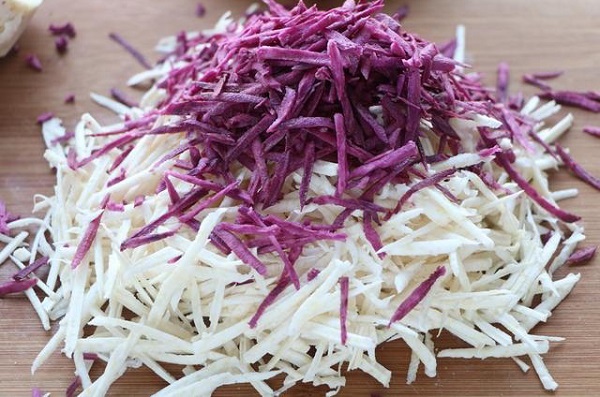 - Bước 1: Khoai môn, khoai lang tím gọt vỏ rửa sạch rồi bào sợi nhỏ.
