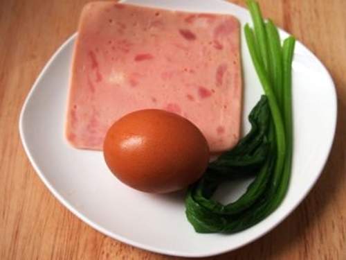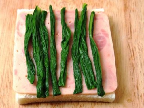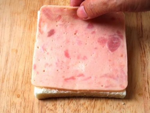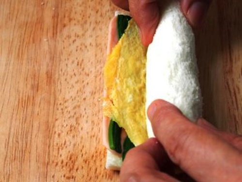 Chú ý: Để miếng cuốn được đẹp, miếng trứng và giăm bông cần ngắn hơn bánh mì 1 chút để khi cuộn tròn không bị lòi ra ngoài.