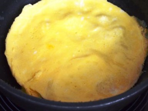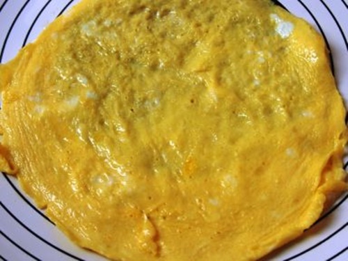 Trứng đập ra bát đánh tan rồi đổ vào chảo tráng thật mỏng