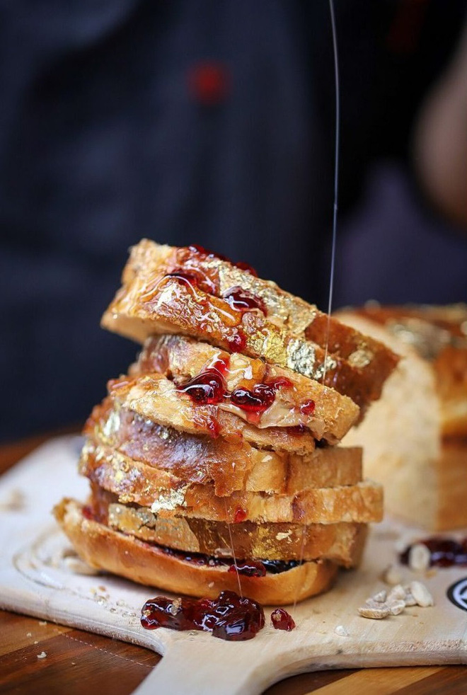 Phiên bản sandwich sang chảnh này gồm bánh mì lát phủ vàng lá, bơ đậu phộng, mật ong, mứt.