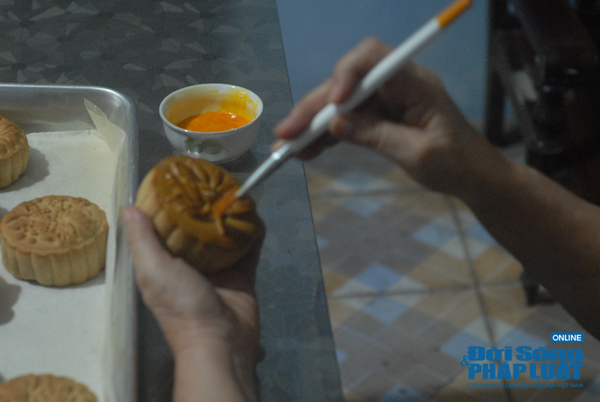 Sau đó, nghệ nhân phết hỗn hợp gồm: Lòng đỏ trứng, dầu hào, dầu mè. Hỗn hợp sẽ tạo màu vàng nâu, mướt bóng cho vỏ bánh. Với lần nướng thứ hai, thứ ba quy trình cũng tương tự, người thợ cần chú ý thời gian nướng bánh.