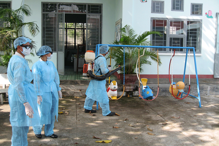 | Phun hóa chất tiêu độc khử trùng tại trường mầm non. Ảnh: Đ.P |
