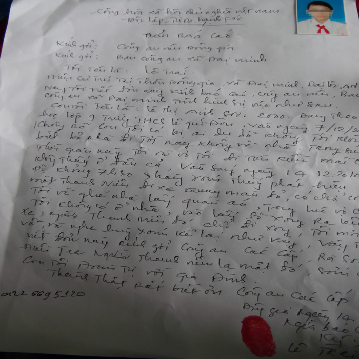 Theo đơn trình báo của gia đình ông Lê T., (ngụ xã Đại Minh, huyện Đại Lộc, Quảng Nam) thì tối 6/12, cháu Lê Thị A. (14 tuổi, học sinh lớp 9, trường THCS Lê Quý Đôn) nói với bà nội là sang nhà bạn để mượn tài liệu nhưng nhiều ngày sau vẫn không thấy về nhà. Nghi ngờ con gái bị bắt cóc, ông T. đã làm đơn báo cáo sự việc với Công an xã Đại Minh để hỗ trợ tìm kiếm.