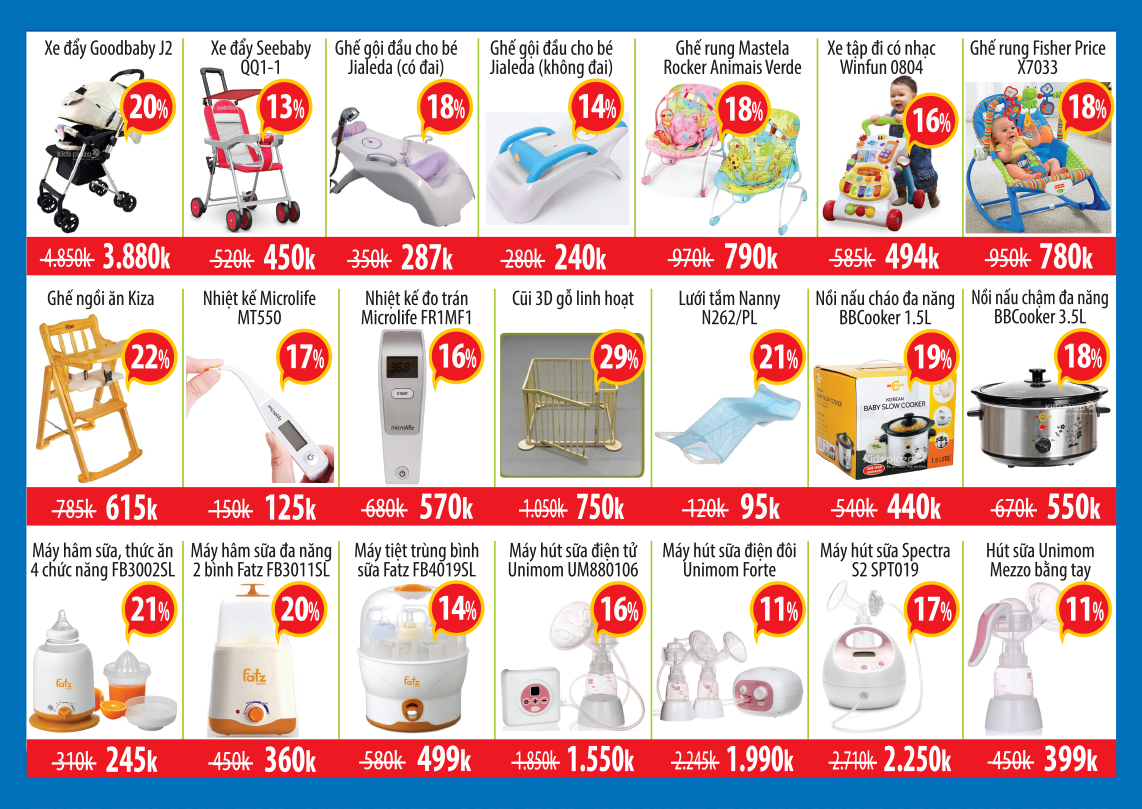 - Giảm 20\% toàn bộ xe đẩy Aprica, toàn bộ hàng Kuku, toàn bộ hàng Canpol Babies, ghế ngồi ô tô cho bé, các ngựa ru ngủ, bộ túi mẹ và bé 5 chi tiết, bình trữ sữa Unimom.
