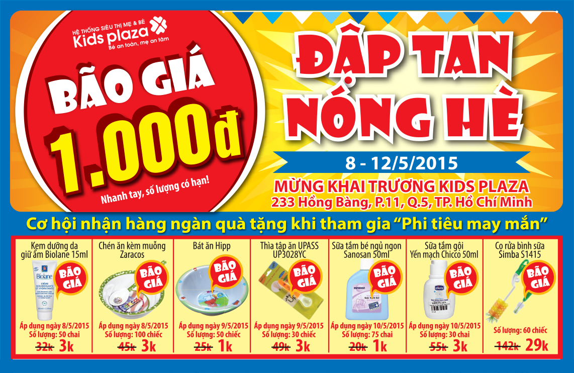 Các mẹ hãy nhanh chân tới Kids Plaza 233 Hồng Bàng (Phường 11, Quận 5, TP HCM) để giải nhiệt mùa hè với những ưu đãi đặc biệt và nhiều quà tặng hấp dẫn. Chương trình “Bão giá 1000 đồng – Đập tan nắng hè” diễn ra trong 5 ngày khai trương, từ ngày 8/5 đến hết ngày 12/5.