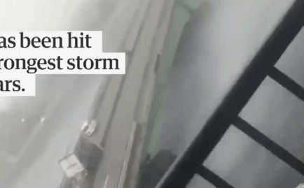 Chiếc xe ô tô đổ gục trong cơn bão. Ảnh cắt từ clip của The Guardian. |