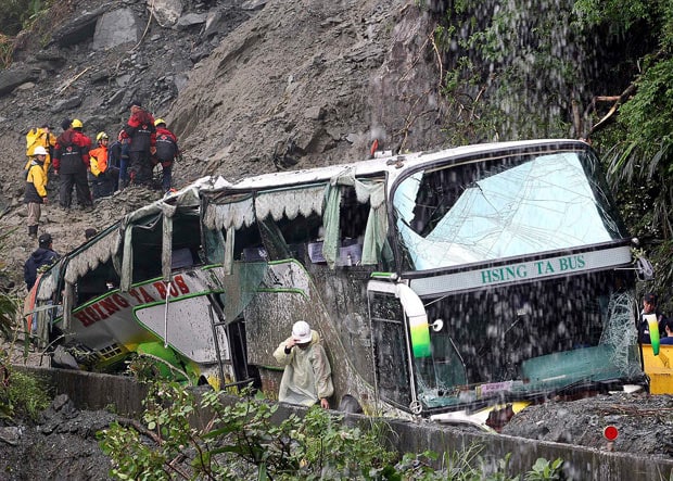 Nhân viên cứu hộ khẩn trương cứu thoát xe buýt bị mắc kẹt sau trận lở đất ảnh hưởng do bão Megi đổ bộ vào Đài Loan. |