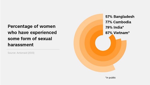 Actionaid là một tổ chức quốc tế chống bất công và đói nghèo hoạt động tại hơn 40 quốc gia trên thế giới. Số liệu điều tra của tổ chức này vào năm 2015 cho thấy châu Á là một điểm nóng về nạn quấy rối tình dục. Ở Việt Nam và Campuchia, cứ 3 trong số 4 phụ nữ được hỏi cho biết họ từng bị quấy rối ở nơi công cộng.