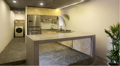 Từ nền nhà, kệ bếp đều được láng bằng xi măng. Thậm chí trần nhà cũng để nguyên bê tông thô mang lại sự gần gũi, đơn giản mà vô cùng thoải mái cho bất kỳ ai bước chân vào không gian này.