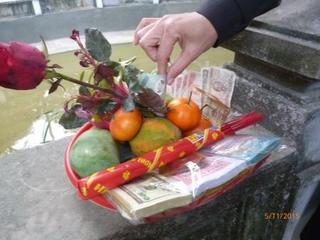 Người dân chuẩn bị đồ lễ gồm hoa quả, hương, tiền, vàng mã. |
