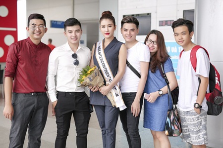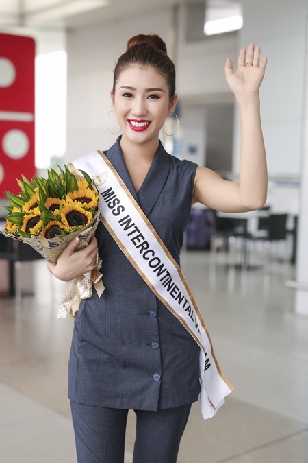 Đại diện Việt Nam tham gia Miss Intercontinental 2016 giản dị và trẻ trung trong bộ trang phục của thương hiệu Ami Fashion. Cô mang theo hành trang sang Sri Lanka gồm 3 valy với đầy đủ các trang phục, dụng cụ cần thiết cho 2 tuần sắp tới tại đất nước Nam Á.