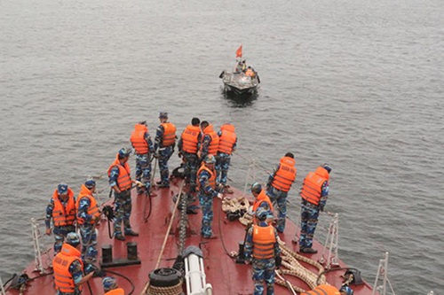 Các chiến sĩ Vùng 4 Hải quân gia cố neo tàu để đảm bảo an toàn. Ảnh: Báo Khánh Hòa |