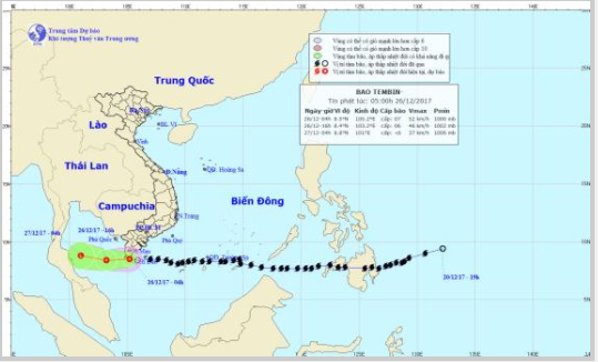 Dự báo trong 12 giờ tới, áp thấp nhiệt đới di chuyển chủ yếu theo hướng Tây, tốc độ di chuyển 15-20km/h, đến 16 giờ ngày 26/12, vị trí tâm áp thấp nhiệt đới ở vào khoảng 8,4 độ Vĩ Bắc; 103,8 độ Kinh Đông. Sức gió mạnh nhất ở vùng gần tâm áp thấp nhiệt đới mạnh cấp 6 (40-50km/giờ), giật cấp 8.