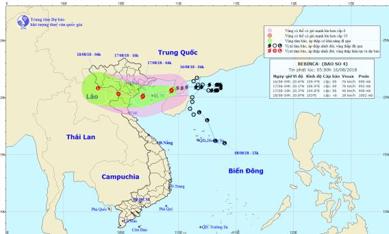 Hồi 4h ngày 16/8, vị trí tâm bão số 4 ở vào khoảng 20,6 độ Vĩ Bắc; 109,4 độ Kinh Đông, cách Móng Cái 210km, cách Thái Bình 320km, cách Vinh 450km. Sức gió mạnh nhất vùng gần tâm bão mạnh cấp 9 (75-90km/giờ), giật cấp 11. Phạm vi gió mạnh cấp 6, giật cấp 8 khoảng 110km tính từ tâm bão.