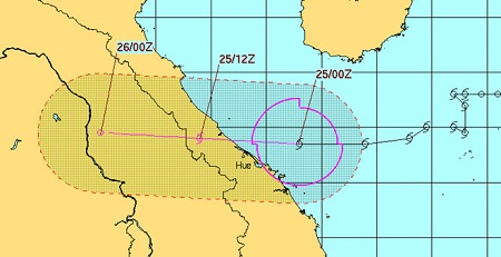 Theo Trung tâm Khí tượng Thủy văn Trung ương, dự báo trong 12 giờ tới, bão di chuyển theo hướng Tây Tây Bắc, mỗi giờ đi được khoảng 15km, đi vào đất liền các tỉnh Quảng Bình-Quảng Trị và suy yếu dần thành áp thấp nhiệt đới. Đến 01 giờ ngày 26/7, vị trí tâm áp thấp nhiệt đới ở vào khoảng 17,5 độ Vĩ Bắc; 105,3 độ Kinh Đông, trên khu vực Trung Lào. Sức gió mạnh nhất ở tâm áp thấp nhiệt đới mạnh cấp 6 (40-50km/giờ), giật cấp 7.