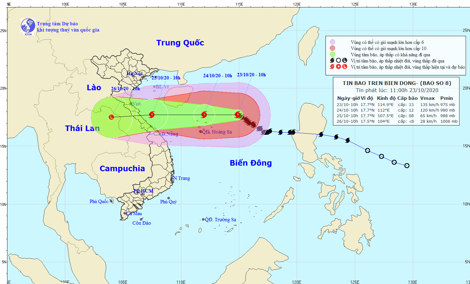 Theo tin tức mới nhất từ Trung tâm dự báo khí tượng thủy văn Trung ương, hồi 10h ngày 23/10, vị trí tâm bão ở khoảng 17,7 độ Vĩ Bắc; 114,9 độ Kinh Đông, cách quần đảo Hoàng Sa khoảng 300km về phía Đông Đông Bắc. Sức gió mạnh nhất vùng gần tâm bão mạnh cấp 12-13 (115-150km/giờ), giật cấp 15. Bán kính gió mạnh từ cấp 6, giật từ cấp 8 trở lên khoảng 260km tính từ tâm bão; bán kính gió mạnh từ cấp 10, giật từ cấp 12 trở lên khoảng 160km tính từ tâm bão.