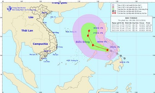 Tin tức trên VTC cho biết, dự báo, bão Tokage sẽ vào Biển Đông vào sáng sớm 26/11, trở thành cơn bão số 9 năm 2016.